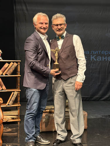 Личен архив Захари Карабашлие. Когато получава статуетката на наградата, развълнуваният Захари Карабашлиев разказва за своя път към творчеството на Канети – за начина, по който го е чел и разбирал през годините. Сн. Ваня Хинкова. Сн. Ваня Хинкова. Защото, както признава авторът: „Моят пристан, това е моят език.“ Канети пази ярки спомени за детството си в България. Само до шестнадесетгодишна възраст той вече е живял в Русчук, Манчестър, Виена, Цюрих и Франкфурт на Майн – живот, белязан от движение, от промяна, от пътувания. „Всичко, което преживях по-късно, вече ми се беше случвало в Русчук.“ За Елиас Канети забравата е вид умиране, а записаното слово – начин да възстановиш частичка от живота, който иначе би потънал. Потъналото – твърди Канети – вика от дълбините, иска да бъде спасено. И може би точно това е най-голямото послание на наградата „Елиас Канети“ през 2025 година – че литературата продължава да лекува неизцерените рани, да спасява, и да ни припомня незапомнените. Рядко гледам видеозапис, предпочитам четенето. Но този път го слушах отново и отново, и свалих целия текст. РАНА – слово на Иван Иванов, произнесено на премиерата на романа РАНА във Враца Великолепният оратор се казва Иван Иванов, юрист. Благодаря на този непознат ми човек, добруджанец, живеещ във Враца, че така проникновено ни представи РАНА на Захари Карабашлиев.